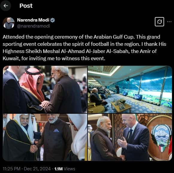 আরবিয়ান গালফ কাপের উদ্বোধনী অনুষ্ঠানে উপস্থিত ছিলেন। এই মহৎ ক্রীড়া ইভেন্টটি অঞ্চলে ফুটবলের চেতনা উদযাপন করে। আমাকে এই ইভেন্টটি দেখার জন্য আমন্ত্রণ জানানোর জন্য কুয়েতের আমির, হিজ হাইনেস শেখ মেশাল আল-আহমদ আল-জাবের আল-সাবাহকে ধন্যবাদ। pic.twitter.com/irYOi3SEvh