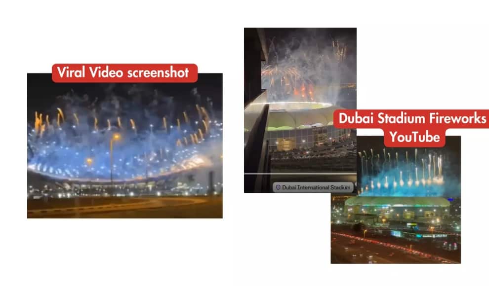 এই ভিডিওগুলির দৃশ্যগুলি ভাইরাল ভিডিওর সঙ্গে মেলে না। আতশবাজির প্যাটার্ন এবং স্টেডিয়ামের গঠন ভিন্ন।