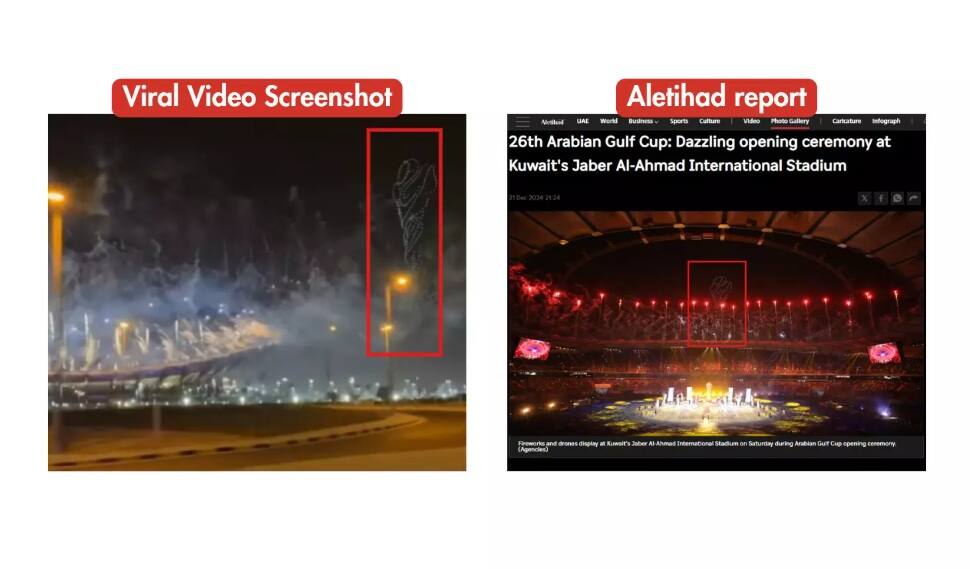 রিপোর্টটি গালফ কাপের উদ্বোধনী অনুষ্ঠানের ছবি দেখায়, যেখানে ট্রফির ড্রোন গঠন দেখা যায়। ভাইরাল ভিডিওর একটি স্ক্রিনশট এবং এই রিপোর্টের ছবির তুলনা নিচে দেখা যাবে।