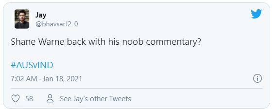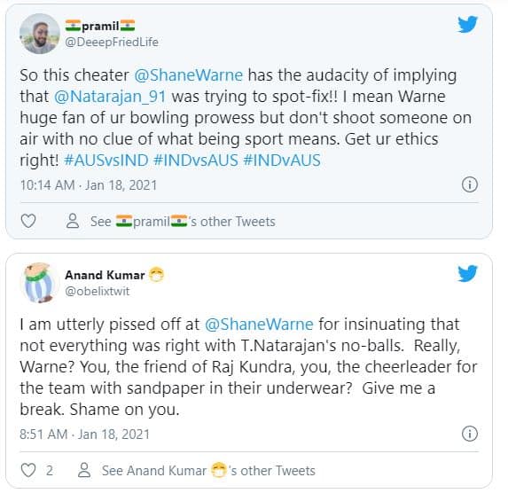 নটরাজন প্রথম ইনিংসে ৬ টি নো বল করেছেন৷ চতুর্থ দিনেও একটি নো বল করেছেন৷ এর মধ্যে পাঁচটিই ওভারের প্রথম বলে৷ এই দেখে তিনি বলেছেন, ‘কিছু অদ্ভুত জিনিস চোখে পড়ল, যখন নটরাজন বল করছিল তখন দেখলাম, তিনি সাতটি নো বল করেছেন৷ আর সেগুলির প্রতিটিই বড়সড় নো বল ছিল৷ ’ ফক্স ক্রিকেটে এই কথা বলেন ওয়ার্ন৷