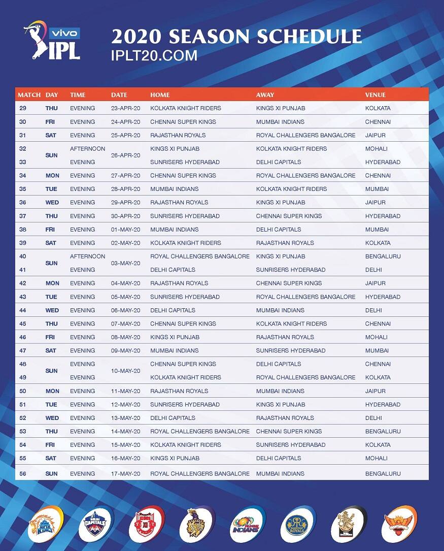 রবিবার উদ্বোধনী ম্যাচ। গতবারের চ্যাম্পিয়ন মুম্বাই ঘরের মাঠে খেলবে ধোনির চেন্নাইয়ের বিরুদ্ধে। সোমবার অর্থাৎ ৩০ মার্চ দ্বিতীয় ম্যাচে দিল্লি ক্যাপিটালস ঘরের মাঠে নামবে কিংস ইলেভেন পঞ্জাবের বিরুদ্ধে। ৩১ মার্চ তৃতীয় ম্যাচে আরসিবির সামনে নাইটরা। ১ এপ্রিল আইপিএল অভিযান শুরু করবে সানরাইজার্স হায়দরাবাদ। প্রতিপক্ষ মুম্বাই ইন্ডিয়ান্স। ২ এপ্রিল চেন্নাই-এর বিরুদ্ধে চেন্নাইতে আইপিএল অভিযান শুরু করছে রাজস্থান।