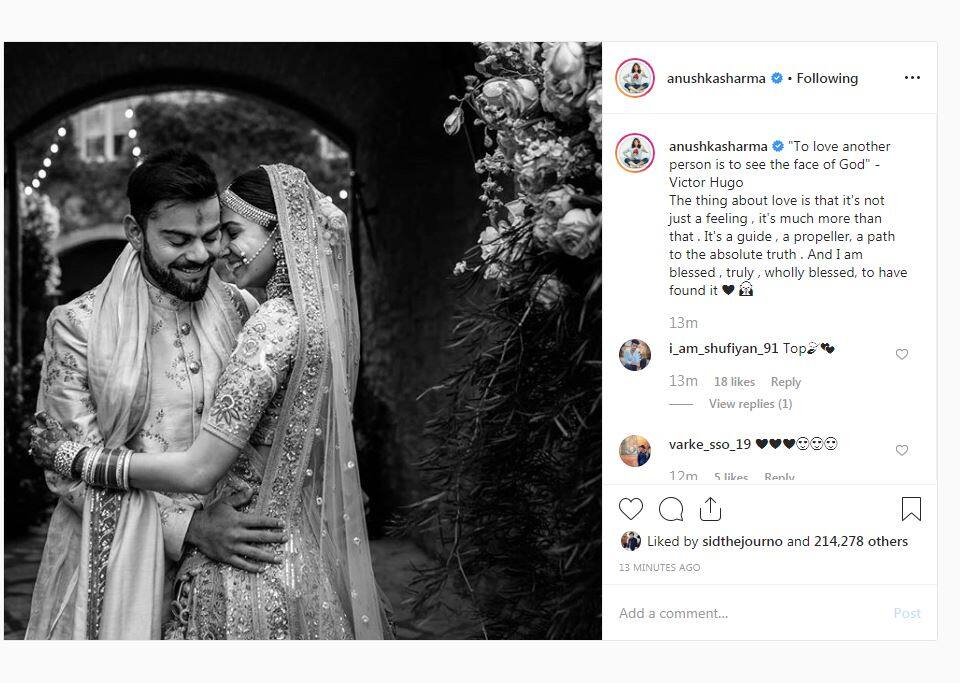 নিজদের রোমান্সের একটি অপূর্ব ফ্রেমবন্দি মুহূর্তের ছবি পোস্ট করে ট্যাগলাইনে বিরাট কোহলি লিখেছেন , "In reality there is only love and nothing else. And when god blesses you with the person who makes you realise that everyday, you have just one feeling, gratitude,"যার অর্থ - ‘‘সত্যি বলতে প্রেম ছাড়া আর কিছুই নেই ,আর যখন ভগবান তোমাকে আশীর্বাদ করলে যে তোমাকে ভালোবাসে সে তোমার জীবনে আসে ৷ সে তোমায় রোজ বুঝিয়ে দেয় কতটা ভালোবাসে ৷ তোমার একটাই অনুভূতি থাকে তাঁর প্রতি কৃতজ্ঞতার ৷ ’’