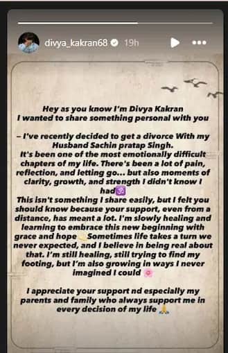 দিব্যা কাকরান ইনস্টাগ্রামে একটি স্টোরি শেয়ার করেছেন। সেখানে তিনি লিখেছেন, ‘‘আমি দিব্যা কাকরান। আমি আপনাদের সঙ্গে কিছু ব্যক্তিগত কথা শেয়ার করতে চেয়েছিলাম। আমি সম্প্রতি আমার স্বামী সচিন প্রতাপ সিং-এর সঙ্গে ডিভোর্স নেওয়ার সিদ্ধান্ত নিয়েছি। এটি আমার জীবনের সবচেয়ে কঠিন সময়গুলির মধ্যে একটি ছিল। অনেক ব্যথা ছিল… কিন্তু এর সঙ্গে এমন কিছু মুহূর্তও এসেছে, যেগুলি সম্পর্কে আমি অজানা ছিলাম।’’