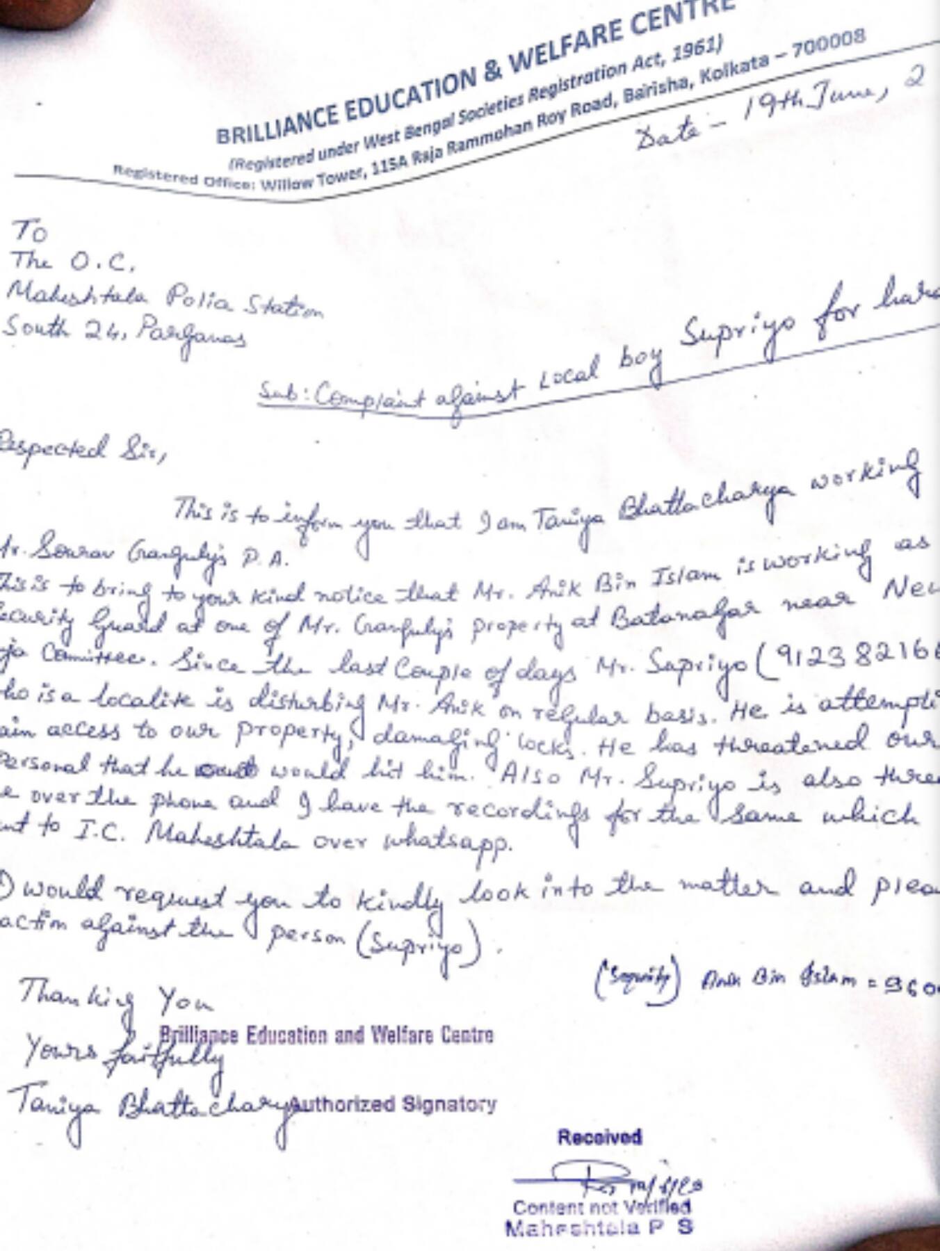 সৌরভ গঙ্গোপাধ্যায়ের বাটানগর এর একটি জমি রয়েছে। যে জমিতে স্কুল তৈরি হওয়ার কথা রয়েছে। জায়গা ঘিরে তালা দেওয়া হয়েছিল। তবে সৌরভের পিএ তানিয়া ভট্টাচার্যের অভিযোগ, কয়েকজন দুষ্কৃতী সেই জমিতে তালা ভেঙে ঢোকার চেষ্টা করেছিল। অভিযোগ, জমিতে জবরদস্তি ঢুকতে গেলে বাধা দিলে সৌরভের নিরাপত্তারক্ষীদের মারধরও করা হয়। নিরাপত্তার যে দায়িত্বে আছে তাকেও ফোন করে হুমকি দেওয়া হয়েছে বলে অভিযোগ।