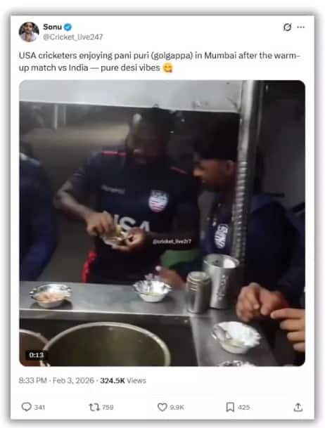 মার্কিন যুক্তরাষ্ট্র দল বর্তমানে মুম্বইতে রয়েছে এবং টি-টোয়েন্টি বিশ্বকাপের প্রস্তুতি নিচ্ছে। তবে, টুর্নামেন্ট শুরুর এক সন্ধ্যায়, দলের বেশ কয়েকজন ক্রিকেটার মুম্বইয়ের স্ট্রিট ফুড উপভোগ করতে বেরিয়েছিলেন। একটি ভাইরাল ভিডিওতে, বেশ কয়েকজন ক্রিকেটারকে রাস্তার ধারে পানিপুরি বা ফুচকা খেতে দেখা গিয়েছে। বিশ্বকাপে অংশগ্রহণকারী মার্কিন যুক্তরাষ্ট্রের দলের অনেক ক্রিকেটারই ভারতীয় বংশোদ্ভূত।