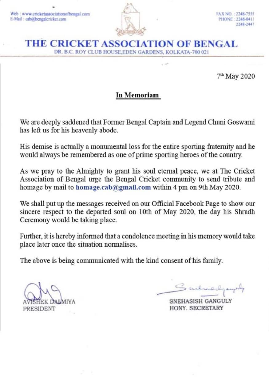 প্রয়াত ক্রীড়াবিদ চুনী গোস্বামীর জন্য অভিনব স্মরণ সভা আয়োজন করল সিএবি।