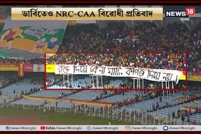 এবার NRC-CAA প্রতিবাদ ছুঁয়ে গেল যুবভারতীর সবুজ ঘাসকেও ৷ প্রতিবাদের ভাষা পোস্টারে-স্লোগানে ফুটে উঠল লাল হলুদ গ্যালারিতে ৷