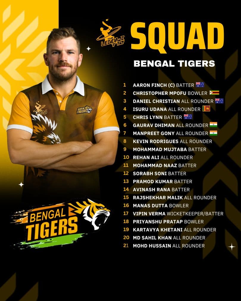 দলের অধিনায়ক হিসেবে আছেন অস্ট্রেলিয়ার প্রাক্তন অধিনায়ক অ্যারন ফিঞ্চ, যিনি তাঁর বিশ্বমানের নেতৃত্বগুণ দিয়ে দলে ভরসা জোগাচ্ছেন। তাঁর সঙ্গে থাকছেন অস্ট্রেলিয়ার আরও এক বিধ্বংসী ব্যাটার ক্রিস লিন এবং অভিজ্ঞ অলরাউন্ডার ড্যানিয়েল ক্রিস্টিয়ান। এই অস্ট্রেলীয় তারকাদের সঙ্গে যুক্ত হয়েছেন শ্রীলঙ্কার পেসার ইসুরু উড়ানা এবং জিম্বাবোয়ের ক্রিস্টোফার মপোফু। এমন অভিজ্ঞ খেলোয়াড়দের উপস্থিতিতে বেঙ্গল টাইগার্স দলটি টুর্নামেন্টে গুরুত্বপূর্ণ ভূমিকা নিতে পারে বলে মনে করছেন ক্রিকেট বিশ্লেষকরা।
