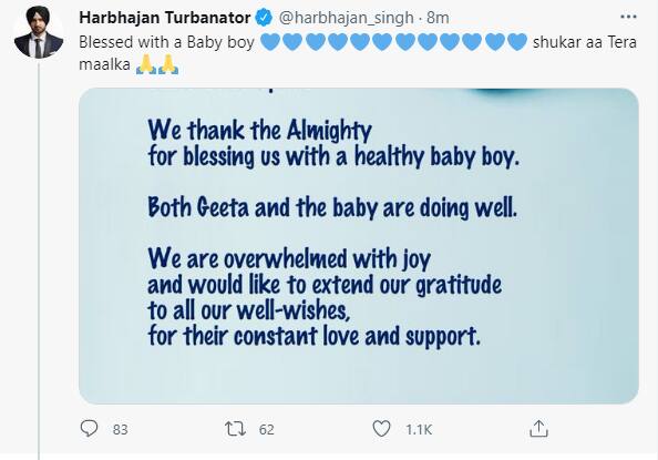 চন্ডীগড় : দ্বিতীয় বার বাবা হলেন হরভজন সিং (Harbhajan Singh) ৷ তাঁর স্ত্রী গীতা বসরা (Geeta Basra) শনিবার জন্ম দিয়েছেন এক পুত্রসন্তানের ৷ সামাজিক মাধ্যমে নিজেই এই খবর জানিয়েছেন ভাজ্জি ৷ গীতা এবং সদ্যোজাত দু’জনেই সুস্থ আছে ৷ শুভাকাঙ্ক্ষীদের ধন্যবাদ জানিয়েছেন হরভজন ৷