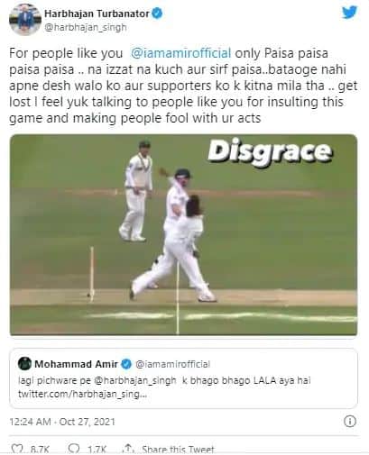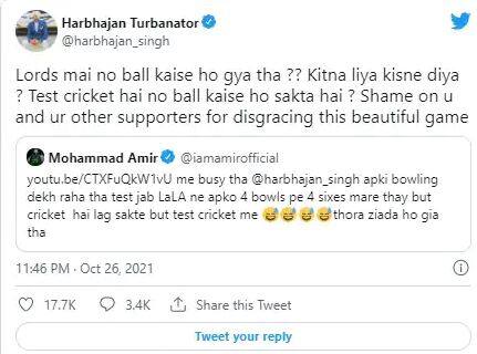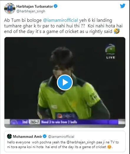 আমির মঙ্গলবার এক ভিডিও শেয়ার করেছিলেন যা ম্যাচের ভিডিও৷ এই ভিডিওতে শাহিদ আফ্রিদি হরভজন সিংকে চার বলে চারটি চার মারছেন৷ আমির এই ভিডিও শেয়ার করেন তখন ভাজ্জি সেটা দেখছেন, তখন তাতে লেখাছিল যখন লালা আপনার বলে চারটি ছক্কা মেরেছিলেন, ক্রিকেটে এরকম হতেই পারে৷ এরপরে হরভজন সিং মহম্মদ আমিরকে জিজ্ঞাসা করেন লর্ডসে আমি কেমন বল করেছিলাম, সেখানের গড় দিয়েছিলেন৷ এরপর তিনি বলেন এরপর আমাদের বিশ্বকাপ জিততে দেখ৷