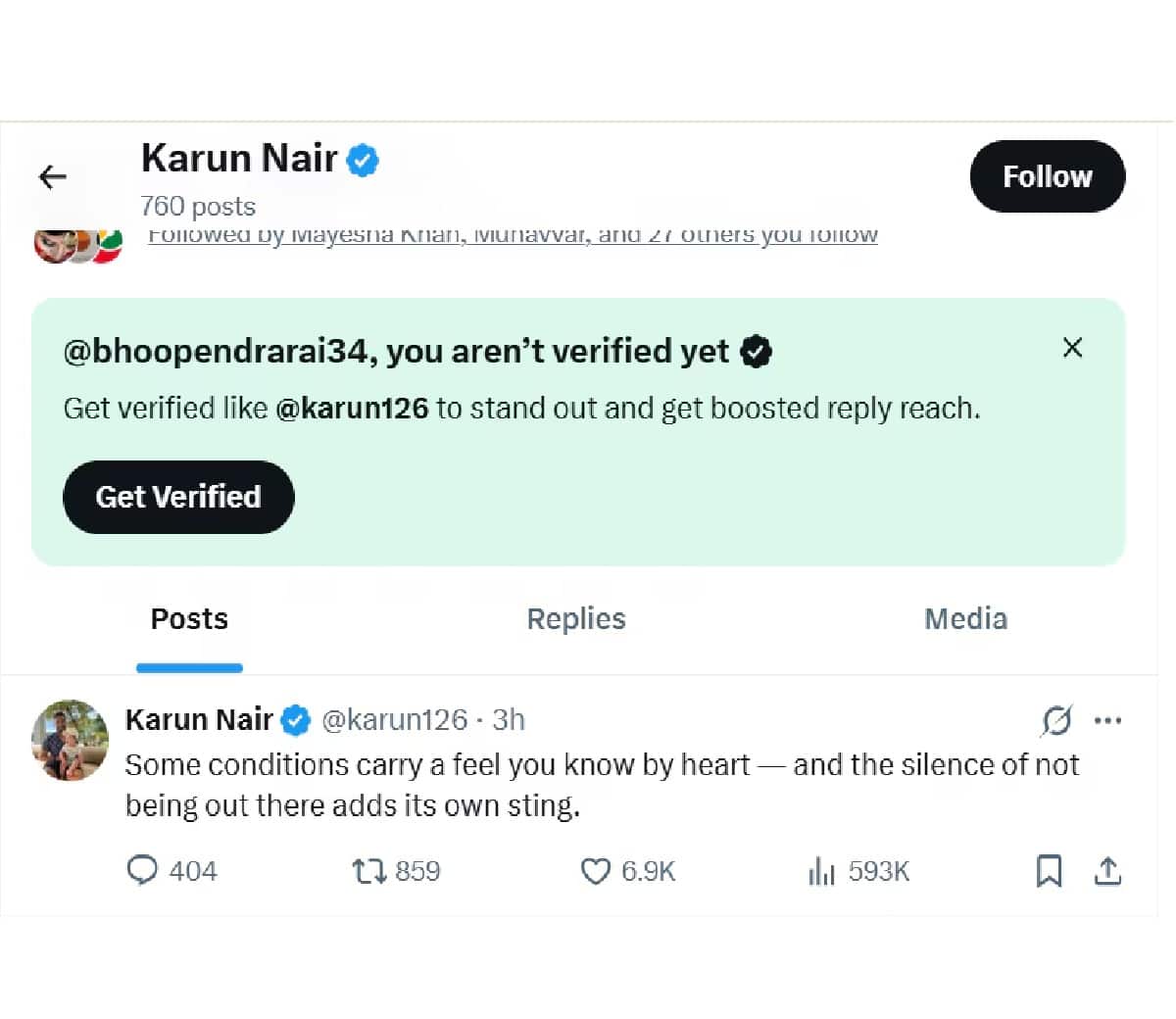 করুণ নায়ার X-এ লিখেছেন, “কিছু সময় পরিস্থিতি এমন থাকে যা আপনি মন থেকে অনুভব করেন, এবং সেখানে উপস্থিত না থাকার নীরবতা তাতে আরও আলাদা যন্ত্রণা যোগ করে।”