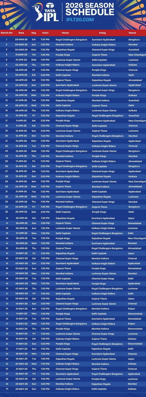 Ipl 2026 : এবারের আইপিএল শুরু ২৮ মার্চ থেকে। প্রথমে ২০টি ম্যাচের সূচি ঘোষণা করেছিল বিসিসিআই। এবার ৭০টি ম্যাচের পুরো সূচি জানিয়ে দেওয়া হল।