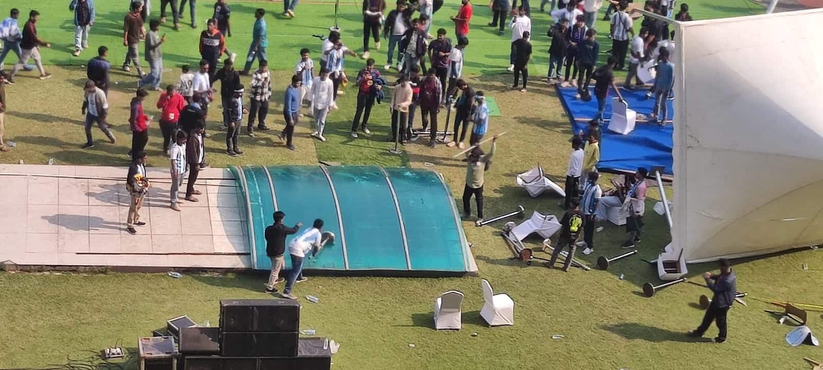 মেসির সমস্ত পোস্টার ছিঁড়ে মাঠের মধ্যেই ফেলা হয়। ‘গোট ইন্ডিয়া ট্যুর’-এর যত পোস্টার ছিল সব ছিঁড়ে ফেলা হয়। দর্শকদের অভিযোগ, এত টাকা দিয়ে টিকিট কেটেও কেন মেসিকে দেখা গেল না? সেই ক্ষোভ থেকেই ছোঁড়া হল বোতল। এমনকী, মাঠে ঢুকে গোল পোস্ট ভাঙার চেষ্টা করা হয়। গ্যালারি নিমেষে ফাঁকা হয়ে যায়। গোটা মাঠ ভরে যায় দর্শকে। পরিস্থিতি পুরোপুরি নিয়ন্ত্রণের বাইরে চলে যায়।