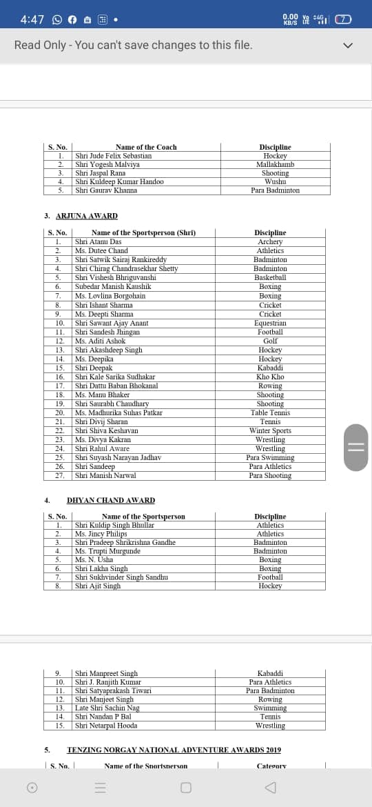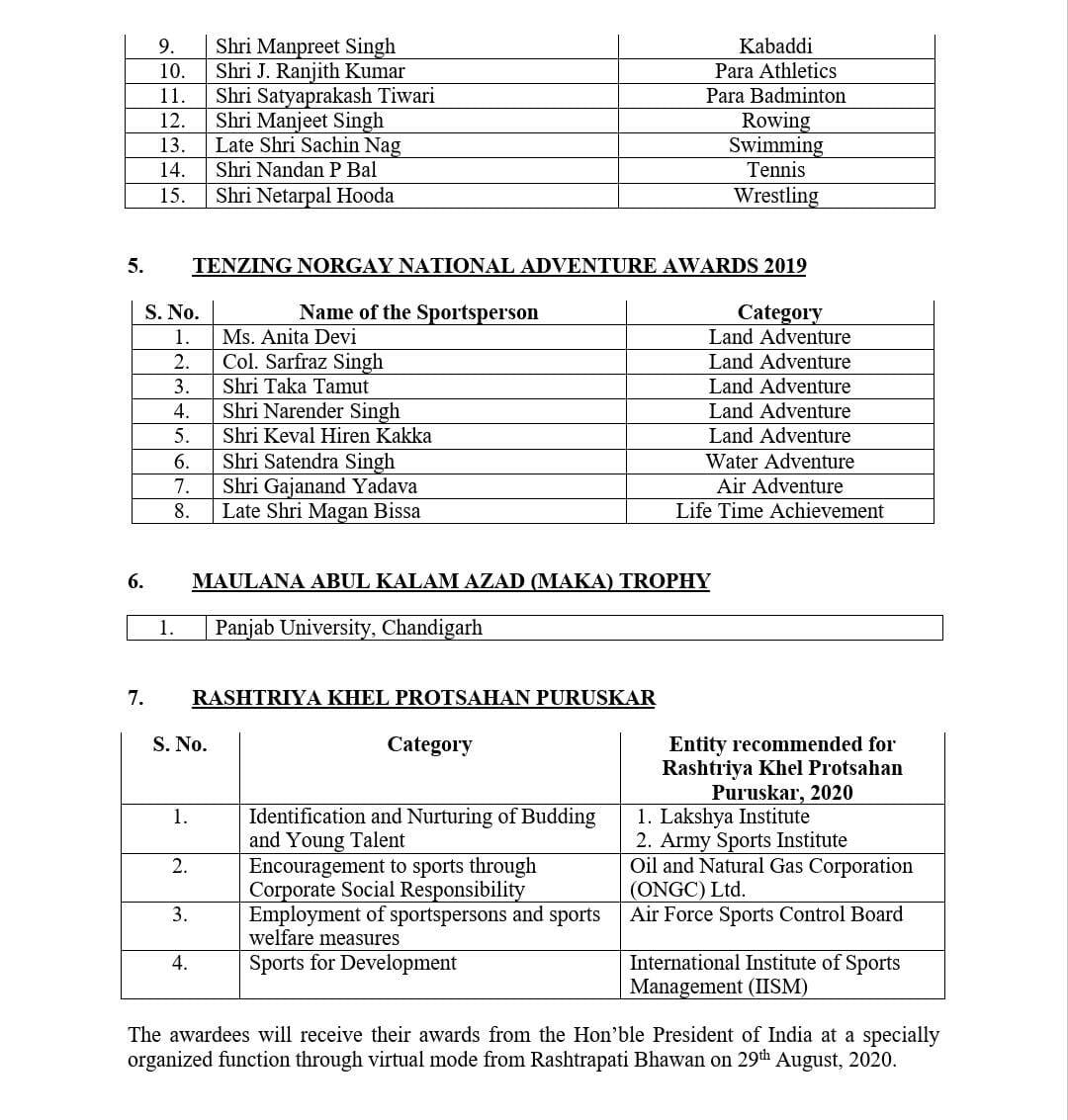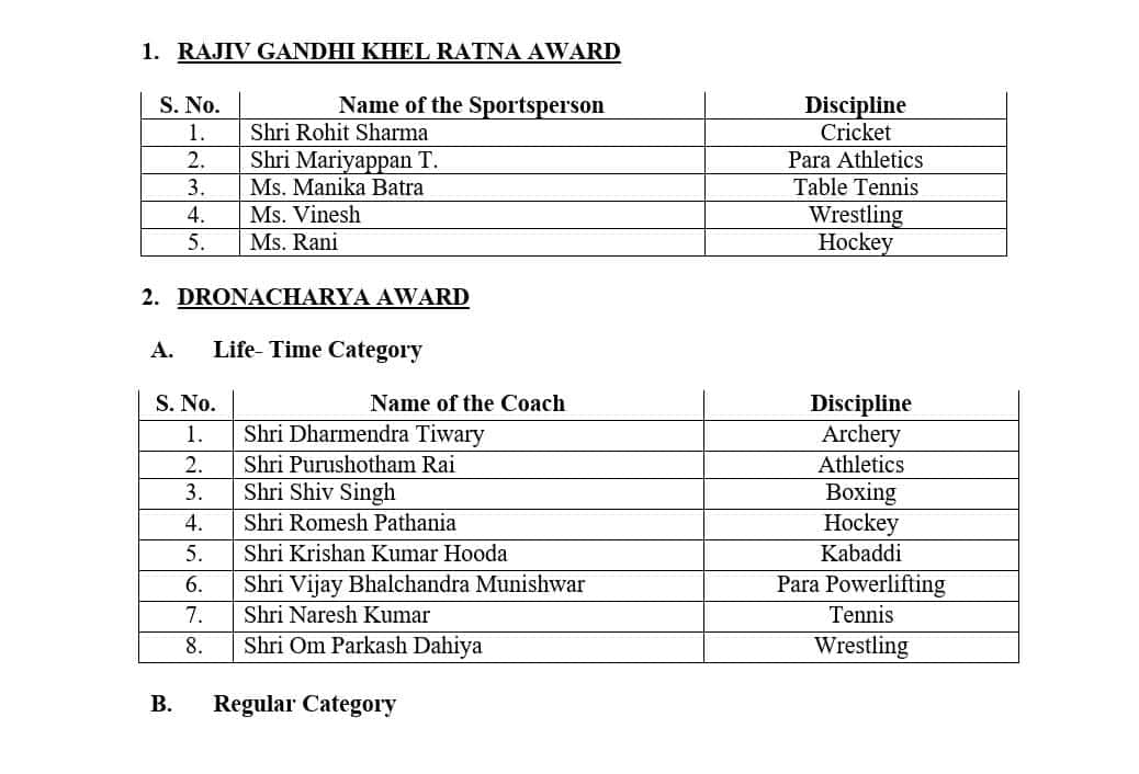 এবারের নির্বাচক কমিটিতে রয়েছেন বীরেন্দ্র সেহওয়াগ প্রাক্তন হকি অধিনায়ক সর্দার সিং, সাই (SAI)-র সদর দফতরে বসে বৈঠক৷ রোহিত জাতীয় দলের হয়ে একাধিক দুরন্ত পারফরম্যান্স করেছেন৷ অন্যদিকে ভিনেশ ২০১৮ -র কমনওয়েলথ গেমসে ও এশিয়ান গেমসে সোনা পেয়েছিলেন৷ ২০১৯ এ এশিয়ান রেসলিং চ্যাম্পিয়নশিপে ব্রোঞ্জ জেতেন৷