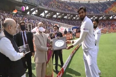 #আহমেদাবাদ: রাষ্ট্রপতি রামনাথ কোবিন্দ (RamNath Kovind) ও স্বরাষ্ট্রমন্ত্রী অমিত শাহের (Amit Shah) হাত থেকে মোতেরায় বিশেষ স্মারক পেলেন ইশান্ত শর্মা৷ শততম টেস্ট খেলার প্রাক্কালে বিশ্বের সবচেয়ে বড় ক্রিকেট স্টেডিয়ামে ইশান্তের এই দিনটা স্মরণীয় হয়ে থাকল৷
