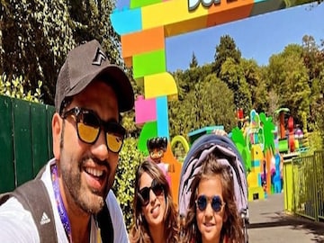 Rohit Sharma enjoying family time with wife and daughter at theme park in United Kingdom. মেয়ে সামাইরা এবং স্ত্রী ঋতিকা মজা করছেন ভারত অধিনায়কের সঙ্গে