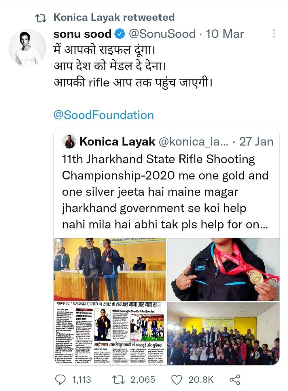 কণিকার এই ট্যুইট দেখে তাঁকে সাহায্যের প্রতিশ্রুতি দেন অভিনেতা সোনু সুদ৷ অভিনেতা কণিকার উদ্দেশে লেখেন, 'তুমি দেশের জন্য পদক জেতো৷ তোমার রাইফেল তোমার কাছে পৌঁছে যাবে৷' প্রতিশ্রুতি মতো সোনু সুদের থেকে রাইফেলও উপহার পান কণিকা৷