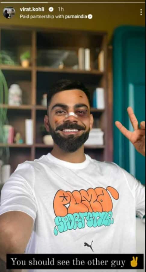 নিজের ইনস্টাগ্রাম স্টোরিতে একটি ছবি শেয়ার করেছেন বিরাট কোহলি। যা এক ঝলক দেখলে আঁতকে উঠবে যে কেউ। ছবিতে দেখা যাচ্ছে বিরাট কোহলির নাকে ব্যান্ডেড, চোখে-মুখে একাধিক আঘাতের চিহ্ন, নানা জায়গায় পড়ে গিয়েছে কালশিটে। মনে হবে বিরাট কোনও দুর্ঘটনার কবলে পড়েছেন না হলে কেউ মেরেছে।
