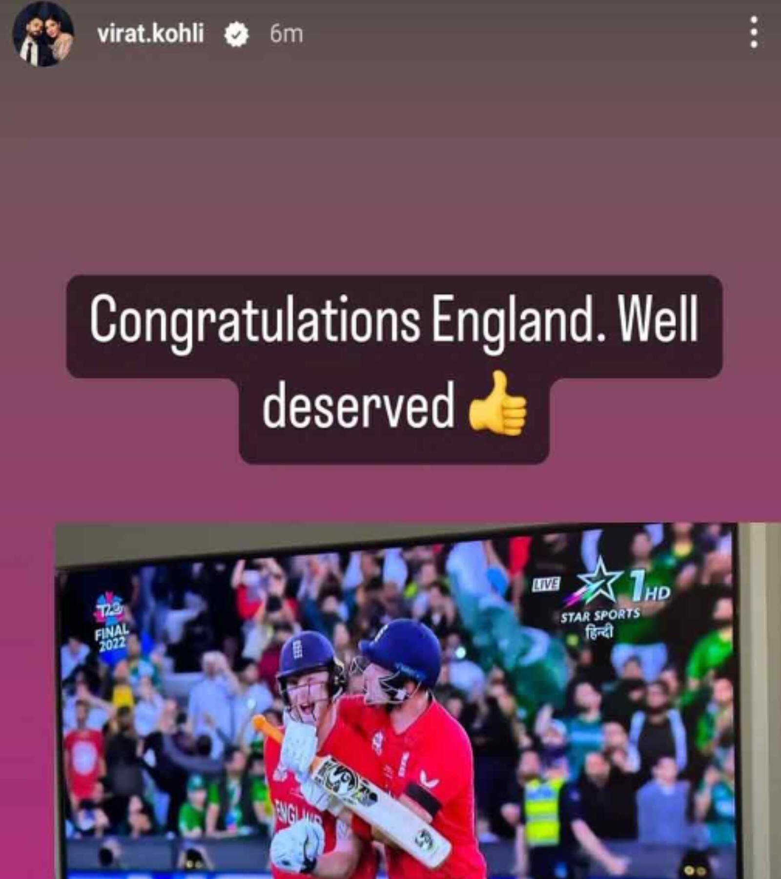 সেমিফাইনাল থেকে বিদায়ের পর দেশে ফিরে এসেছে ভারতীয় দল। হতাশ ও ভগ্ন হৃদয় নিয়ে যে তিনি দেশে ফিরেছেন সেই কথা সোশ্যাল মিডিয়ায় আগেই জানিয়েছেন বিরাট কোহলি। তবে ফাইনাল দেখতে ভোলেননি তিনি। টিভির পর্দায় ইংল্যান্ড বনাম পাকিস্তান ম্যাচ পুরোটাই দেখেন বিরাট। ম্যাচ শেষে নিজের ইনস্টা স্টোরিতে ইংল্যান্ড দলকে প্রশংসায় ভরিয়ে দেন কোহলি। একটি ছবি পোস্ট করেছেন এবং লিখেছেন যে, ‘ইংল্যান্ড তোমাদের শুভেচ্ছা, আপনারা সত্যি যোগ্য।’