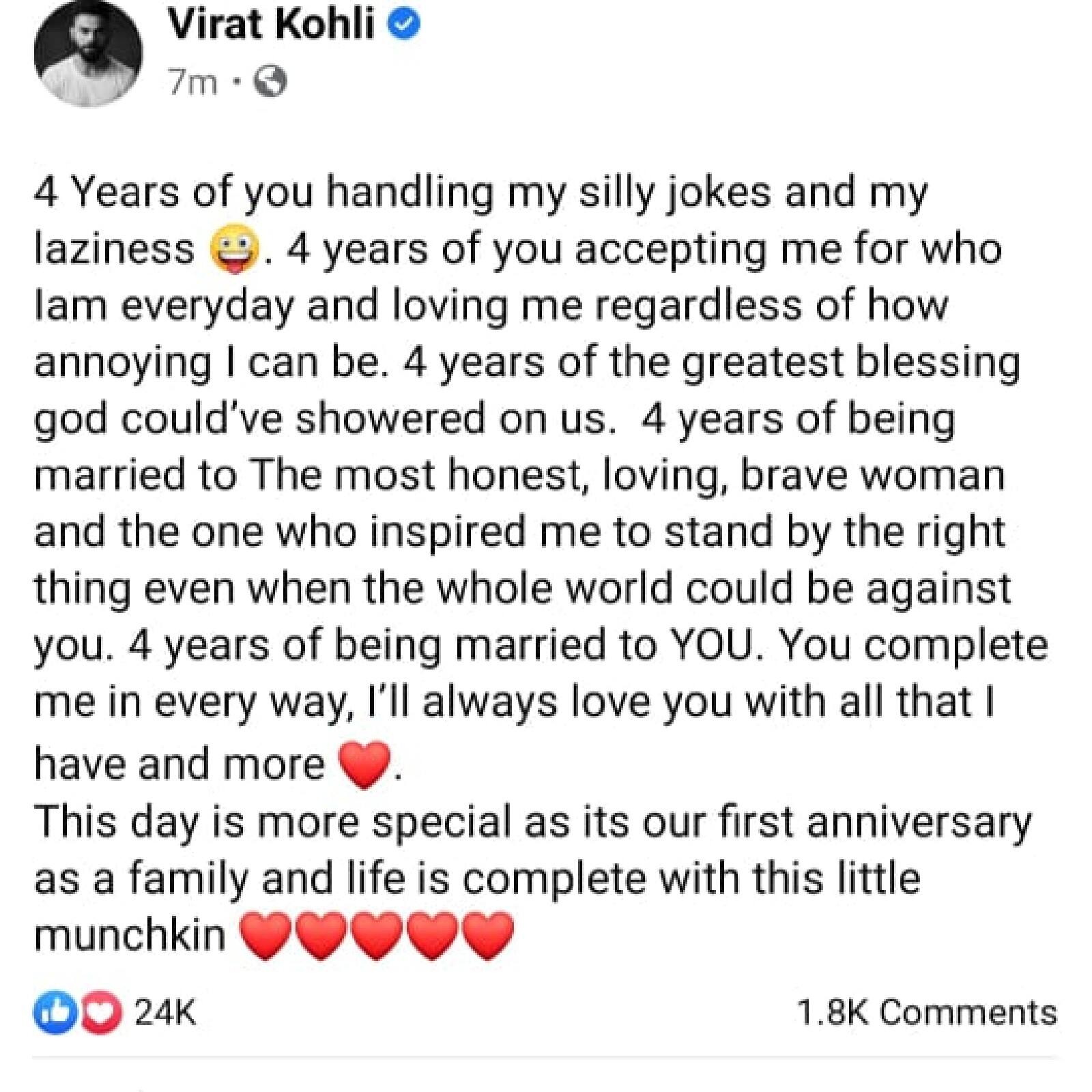 কোহলি এদিন লিখলেন, 'চার বছর ধরে আমার বস্তাপচা জোকস হজম করছো। আমার মতো একটা কুঁড়ে মানুষকে চার বছর ধরে ভালবাসছ। আমি যেমন, তেমনভাবেই তুমি আমাকে ভালবেসেছ। চার বছর ধরে ঈশ্বর আমাদের জীবনে আশীর্বাদের বৃষ্টি দিয়েছে। চার বছর ধরে এক সত্, সাহসী ও ভালবাসায় ভরপুর মানুষের সঙ্গে রয়েছি। তুমি সব সময় আমার পাশে অনুপ্ররণা হয়ে থেকেছো। যখন গোটা পৃথিবী আমার বিরুদ্ধে গিয়ে দাঁড়িয়েছে, তখনও তুমি ছিলে পাশে। আমি আমার সবটা দিয়ে তোমাকে সারাজীবন ভালবেসে যাব। পরিবার হিসাবে এটা আমাদের প্রথম বিবাহবার্ষিকী। এখন এই ছোট্ট মেয়েকে নিয়ে আমাদের জীবন পরিপূর্ণ।"