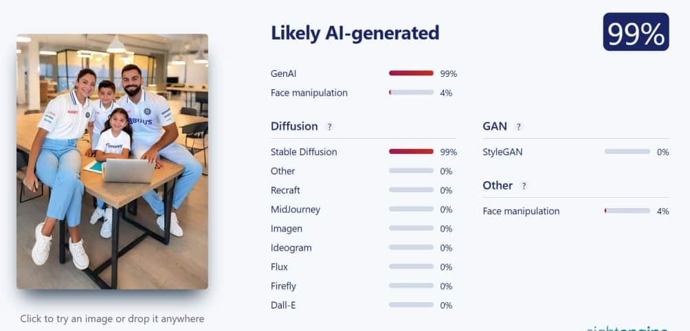 এআই ইমেজ ডিটেকশন টুল সাইট ইঞ্জিনও বলেছে যে এটি এআই-নির্মিত হওয়ার ৯৯ শতাংশ সম্ভাবনা রয়েছে।