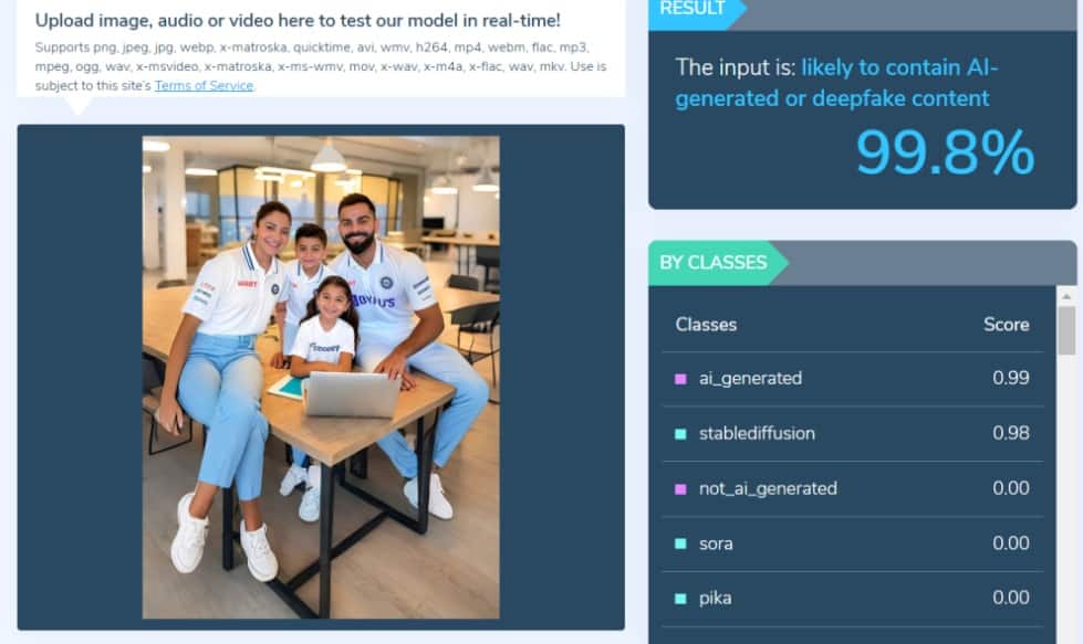 ভাইরাল ছবিটি সম্পর্কে জানতে, আমরা ছবিটি মনোযোগ সহকারে দেখেছি। আমরা ছবিতে বেশ কিছু ত্রুটি খুঁজে পেয়েছি। বিরাট কোহলির বাচ্চাদের বয়স ৪ (ভামিকা) এবং ১ (আকয়) বছর, কিন্তু ছবিতে দেখা বাচ্চারা দেখতে আরও বড় দেখাচ্ছে। এছাড়াও, ছবিতে, অনুষ্কা শর্মার ডান হাতের আঙ্গুল নেই এবং বিরাট কোহলির ডান হাত পিছনে রয়েছে তবে তাঁর ডান হাতের আঙুলগুলি ল্যাপটপের কাছে দৃশ্যমান। তাঁর বাঁ হাতের আঙুলগুলো ল্যাপটপের ভেতরের দিকে এদিক-ওদিক ঘুরছে। বাচ্চারা টেবিলের মাঝখান দিয়ে যাচ্ছে। আমাদের সন্দেহ, এই ছবিটি কৃত্রিম বুদ্ধিমত্তার সাহায্যে তৈরি।