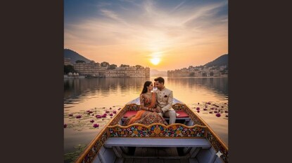 “Generate a romantic pre-wedding scene on the serene lakes of Udaipur. The couple sits in a traditional wooden boat, surrounded by calm water and palace reflections. Golden hour light adds warmth, emphasizing intimacy and elegance.”