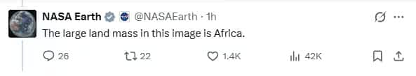 কিছু ব্যবহারকারী ছবিতে দেখা স্থলভাগ নিয়ে প্রশ্ন তুললে, নাসা Earth অ্যাকাউন্ট থেকে উত্তর দেওয়া হয়েছে—“এই ছবিতে যে বড় স্থলভাগটি দেখা যাচ্ছে, সেটি আফ্রিকা।”