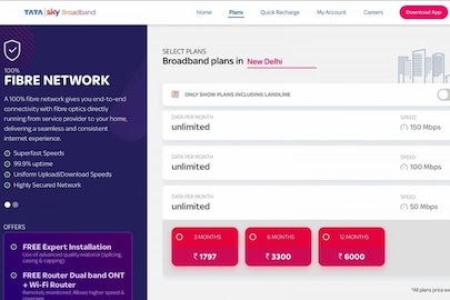 Tata Sky Broadband - ৫০ এমবিপিএস স্পিড ৩ মাসের জন্য নিলে খরচ পড়বে ১৭৯৭ টাকা, ৬ মাসের জন্য ৩৩০০ টাকা এবং ১২ মাসের জন্য দিতে হবে ৬০০০ টাকা- এক্ষেত্রে প্রতি মাসে আলাদা করে রিচার্জ করানোর দরকার পড়বে না।
