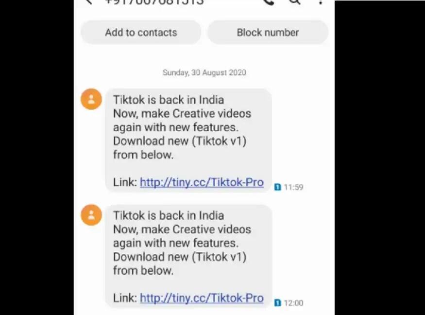 হ্যাকাররা গ্রাহকদের আলাদা আলাদা টিকটক ভার্সানের নাম দিয়ে একটি লিংক শেয়ার করছে। বেশ কিছু গ্রাহকদের কাছে অপরিচিত নম্বর থেকে একটি সন্দেহজনক মেসেজে এসেছে, যেখানে বলা হচ্ছে যে ভারতে ফিরে এসেছে টিকটক। এই মেসেজে একটি TiktokPro এর লিঙ্ক দেওয়া হচ্ছে, যেটিতে ক্লিক করলে একটি apk ফাইল ডাউনলোড হয়ে যাবে।