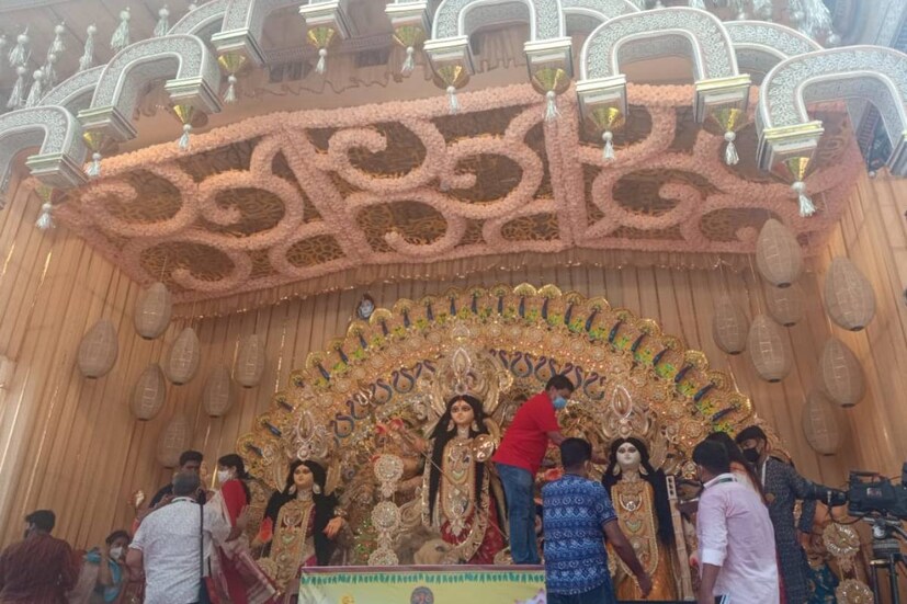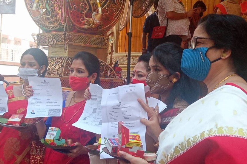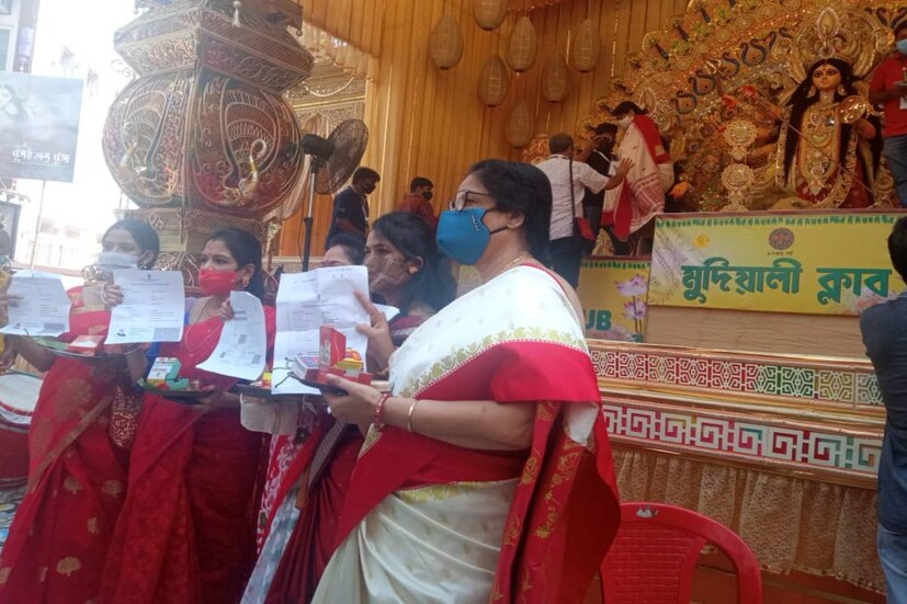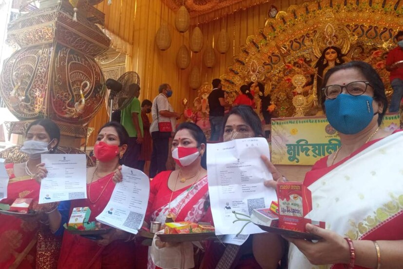 Mudiali Club Durga Puja: এক হাতে সম্পূর্ণ কোভিড টিকার শংসাপত্র, অন্য হাতে বরণডালা, মুদিয়ালি ক্লাবে অভিনব সিঁদুরখেলা