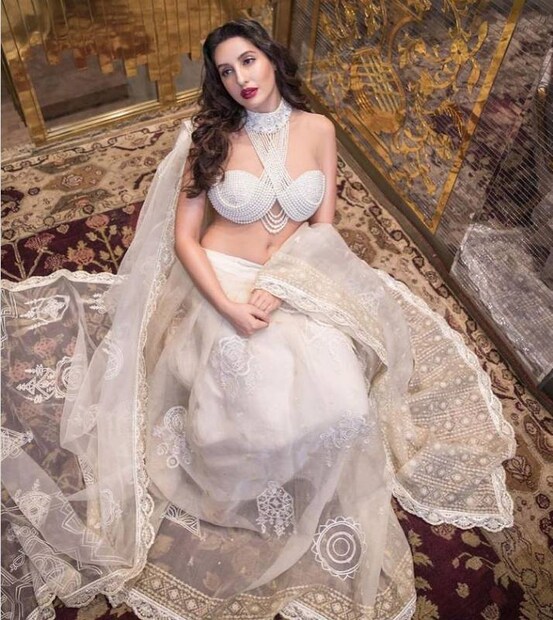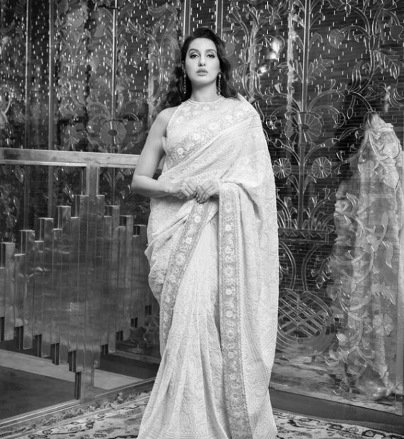 Nora Fatehi in a pearl and crystal blouse: অরগ্যাঞ্জা ঢাকাই জামদানির সঙ্গে মুক্তো ও স্ফটিকের ব্লাউজে নোরা যেন অপার্থিব সুন্দরী