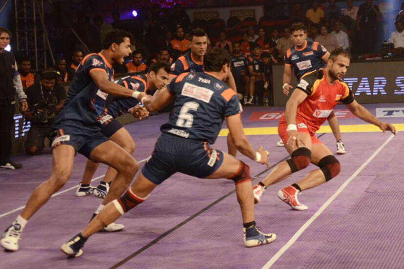 প্রো কবাড্ডি লিগে বেঙ্গল ওয়ারিয়ার্স এবং বেঙ্গালুরু বুলস ম্যাচের একটি ছবি